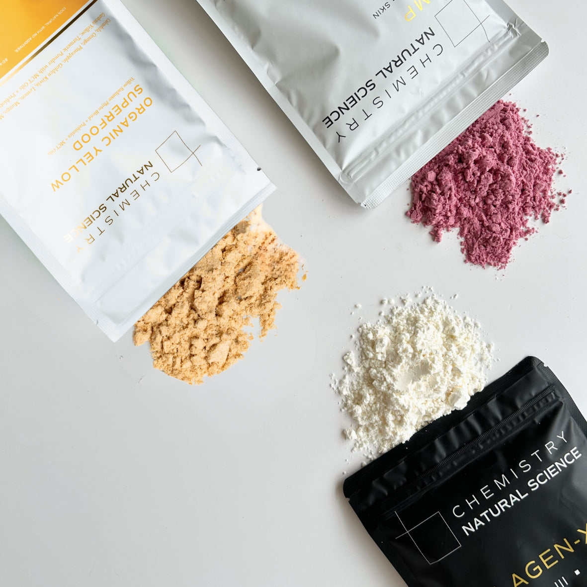 Mix 15 g PLUMP + 10 g COLLAGEN-X + 5 g YELLOW RADIANCE into water, juice, a smoothie, yoghurt, or porridge.